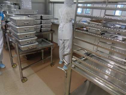 今が旬のぶりをしょうゆダレに漬け、鉄板に並べてから均等に山椒をかけた山椒焼きです。各学級の食缶にぶりを入れた後、別の調理員さんがダブルチェックをして学級の数を再度確認しています。