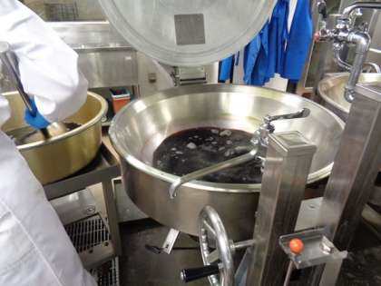 デザートのゼリーも給食室でつくっています。釜でゼラチンをしっかりと煮溶かしてからゼリー液を加えています。最後にゼリー液をカップに入れやすくするために、消毒済みのタライに液を移しています。