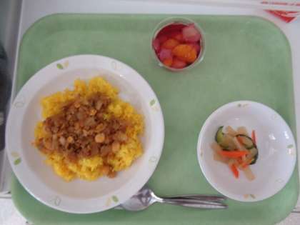 今日は学習発表会 保護者鑑賞日です。全校のみなさんがしっかりと食べられるように、キーマカレーライス・クランベリー味のフルーツポンチにさいました。フルーツポンチには星形のナタデココも加えてかわいい1品になりました。