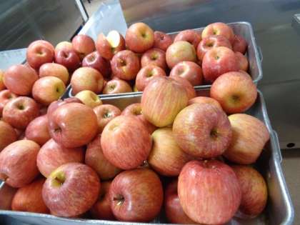 今日のりんごは「サンふじ」です。太陽の光をたっぷり浴びた「ふじ」を「サンふじ」といいます。甘みが強いりんごを1個ずつ皮むきをしていきます。