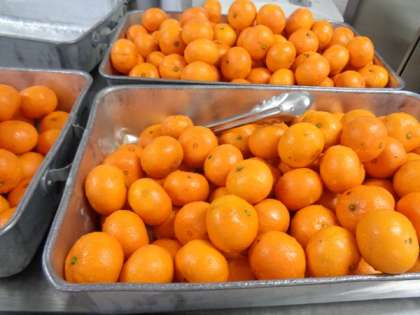 毎年1月24日から30日は全国学校給食週間です。この週間では、地域の食材をいただく地産地消を主に行います。キャベツは町田市・にんじんは八王子市の新鮮な野菜を給食につかいました。くだもののオレンジは「津のかがやき」、清美オレンジと早生みかんを交配した品種にアンコールを掛け合わせたものです。