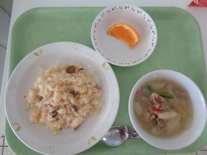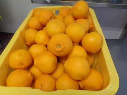 今日のフルーツはデコポン、ヘタの凸が特徴ですが甘くて食べやすいフルーツです。デコポンは熊本県産の特別栽培のものをを使用しました。