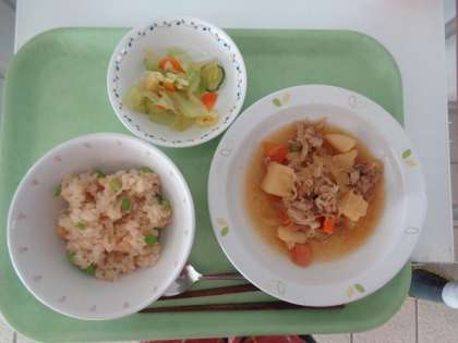 2月3日は節分、一日早い節分の献立にしました。しょうゆ味に炊いたおこわと大豆と枝豆を混ぜた、お豆おこわです。もちもちとした食感のおこわで、豆をおいしく食べることができました。