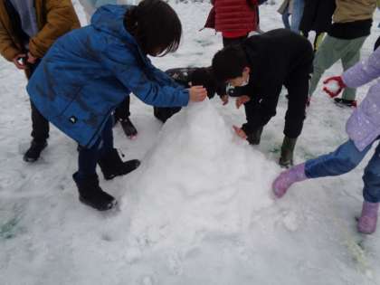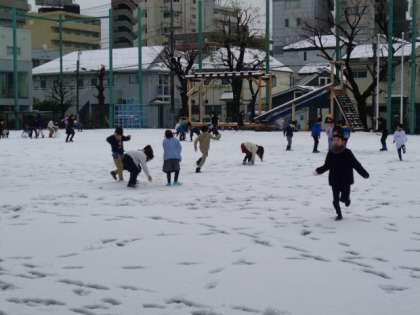 昨日の積雪で、校庭は一面真っ白でした。休み時間になると、子どもたちが楽しそうに雪遊びをしていました。あちらこちらに雪だるまが現れました。