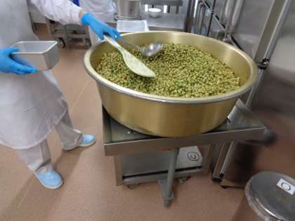 今日はリクエスト給食です。カリッと揚げた大豆とのり塩味がよく合う「のり塩大豆」が選ばれました。青のりと塩を均等の味になるように、大豆にしっかりと混ぜています。