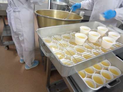 デザートのゼリーはゼリー液から給食室でつくります。釜でじっくりと寒天を煮溶かしてジュースを加え、カップに1個づつ入れていきます。