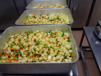 マセドアンとはフランス語で「さいの目切り」という意味です。じゃがいもや野菜を小さめの角切り「さいの目切り」にしてサラダにしました。
