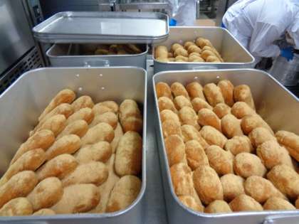 今日はリクエスト給食、揚げパンです。大きな釜で揚げたコッペパンにきなこをまぶしました。揚げたての揚げパンはとても好評で、しっかりと食べていました。
