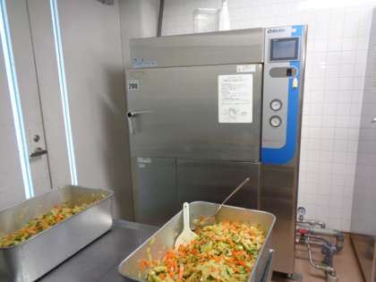 駒沢小学校の給食室には真空冷却器があるため、ゆでた野菜は水冷ではなく真空冷却器で冷やします。しっかりと冷ました野菜をゴマダレと混ぜています。