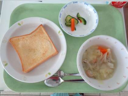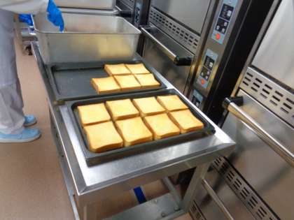 給食室には大きなオーブンが2台あります。バターペーストをぬった食パンをオーブンで焼いたトーストが焼き上がりました。各学級ごとに数えています。