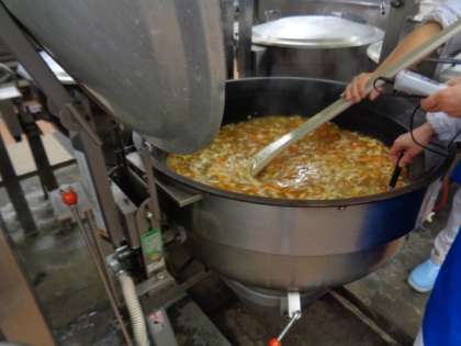 具だくさんの吉野汁を大きな釜でつくっています。最後に片栗粉でとろみをつけ、中心温度を確認したら出来上がりです。。