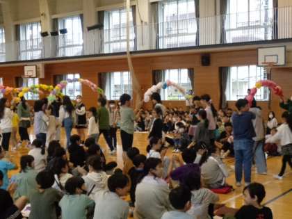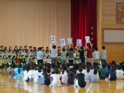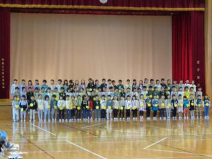 本日の1時間目、1年生を迎える会を行いました。2年生がプレゼントしたメダルをかけ、6年生と手をつなぎ、花のアーチをくぐって入場した1年生。元気いっぱいの歌声を披露してくれました。3年生から6年生は、給食・行事・各教室・学校のきまりについて発表しました。