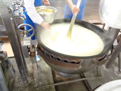 コーンをたっぷりと加えたシチューをつくっています。シチューに加えるルウも手作り、ゆっくりと加えて煮溶かして、とろみをつけています。