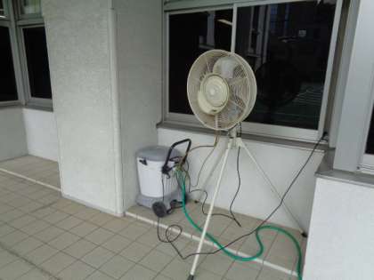 この時期になると、校庭側の職員室前に大きな扇風機が登場します。だんだん気温が高くなってくるので、休み時間や体育の時間、そしてこれから本格的に始まる運動会の練習で使用します。この扇風機はミストが出るようになっており、設置に時間がかかります。毎年主事さんが子どもたちのために2台設置します。花壇の草取りや校内の清掃等、いつも学校と子どもたちの安全のために活動してくださっています。