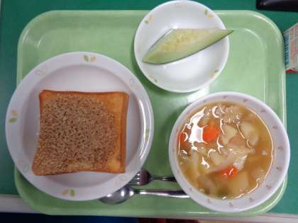 今日の果物はメロン、給食業者さんから届いたメロンをしっかりと洗いカットします。旬のメロンを子どもたちはしっかりと食べていました。