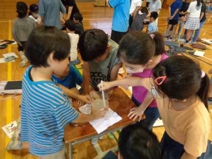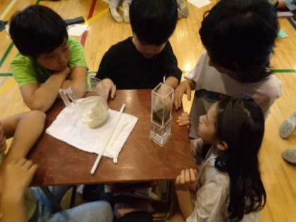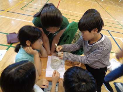 5,6時間目、出前授業の水道キャラバンがありました。グループごとに、「ビーカーに入った水に砂を入れ、凝固剤で砂を固めてろ過をする」という実験を行いました。砂で濁った水がきれいになる様子を見て、みんな驚いていました。