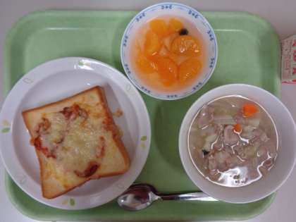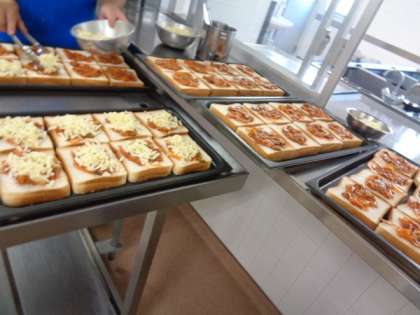 給食室でつくられた野菜をたっぷりと加えたピザソースを食パンに乗せ、チーズをのせてオーブンで焼いていきます。全員に均等にソースが盛れるように、ソース完成時の量を計測してから作業をしています。