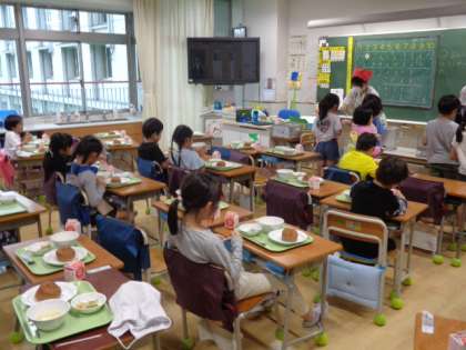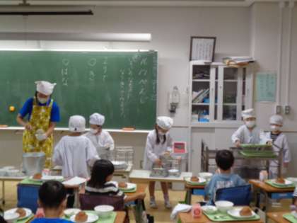 6月に入り、1年生も給食当番が中心になって配膳をしています。白衣と帽子を身に着け、マスクをして準備です。当番さんは自分の仕事を一生懸命やっていました。仕事が終わると「給食当番楽しい!」と教えてくれました。1年生はどのクラスも、全員前を向いて食べています。
