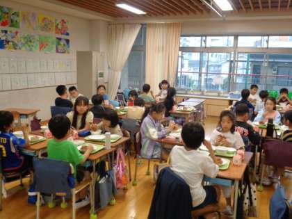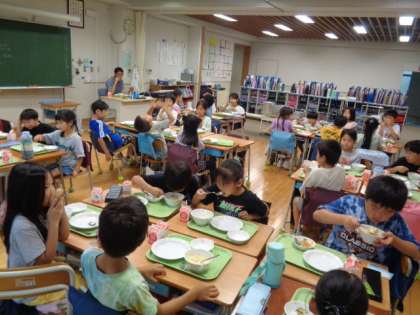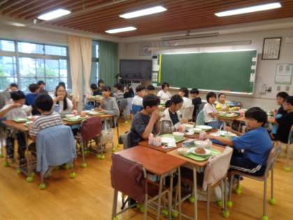 2年生から6年生はグループになって楽しく給食を食べていました。お昼の放送が始まるとみんな耳を傾けます。今日の放送委員会の企画は「イントロクイズ」でした。