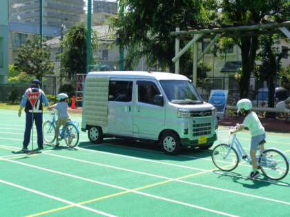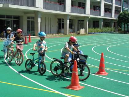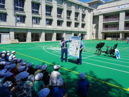 1.2時間目、3年生が自転車教室を行いました。世田谷警察署の方から、正しい自転車の乗り方・ルールを教えていただきました。保護者の皆様にもご協力いただき、一人一人が正しい乗り方を体験しました。