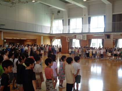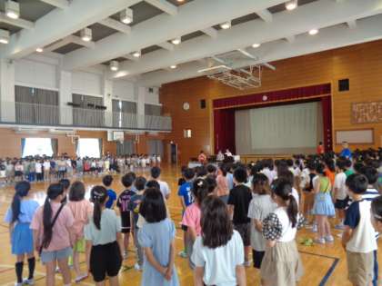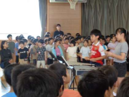 今朝は音楽朝会でした。全校で♪世界が一つになるまで♪を歌いました。今回は、6年生の代表2名が鉄琴でメロディーを演奏してくれました。すてきな歌声が体育館に響きました。