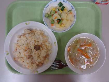 今日はジュリアンスープ、キャベツの千切りなどの野菜をたっぷりと加えたスープです。煮込んで食べやすくなり、野菜が食べやすい1品です。