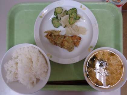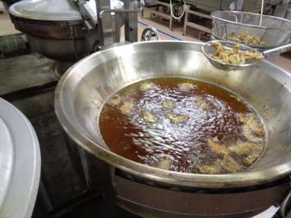 天ぷらの衣に青のりを混ぜて揚げた磯辺揚げにしました。青のりの香りと衣の食感がおいしい揚げものです。大きな釜で魚を揚げていきます。