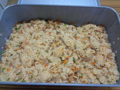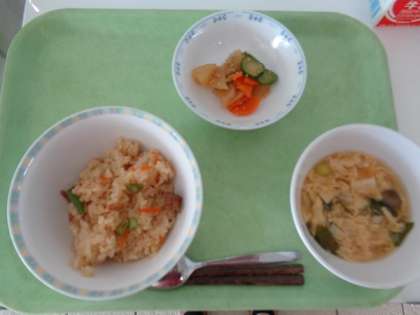 今日のごはんは千切りの豚肉・たけのこなどの具の中華風おこわです。もち米いりのしょう油味のごはんで食欲を増し、子どもたちはしっかりと食べてました。