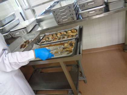 今日の魚はぶり、照り焼きのタレに漬けて粉山椒を1枚ずつかけてオーブンで焼きました。各学級ごとにしっかりと数えています。