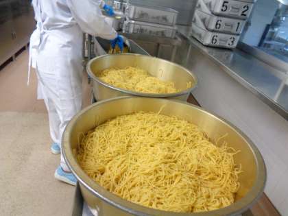 今日は人気があるスパゲッティ料理です。大きな釜でスパゲッティをゆで、油を混ぜて各学級ごとに盛り付けをします。