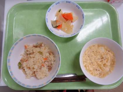 食物アレルギー対応の除去食は、給食室で完全除去食をつくっています。通常食と同じ様に計量をして1人ずつ包装して名前付きシートを貼り、安全に児童が食べられるように配慮をしています。