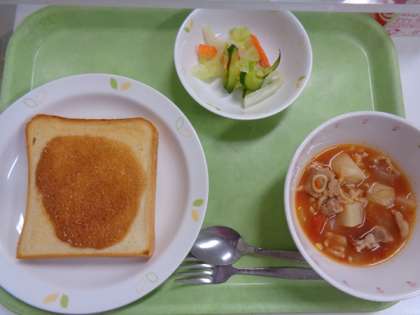 バターペーストにきなこを加えて食パンに塗り、オーブンで焼いています。きなこの香りがおいしいトーストを、おいしく食べていました。