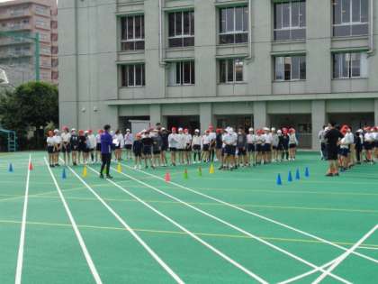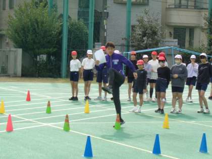 駒澤大学陸上競技部の藤田監督をゲストティーチャーにお迎えして、走り方教室を行いました。走るときに大切な股関節を柔らかくするストレッチから始まり、腕を振る練習やリズムよく走る練習など、中身の濃い1時間でした。最後に6年生から箱根駅伝に関する質問が出ました。藤田監督からは「仲間でたすきを繋いで走ることの意味」についてのお話があり、みんな真剣な表情で聞いていました。