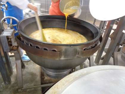 とろみをつけたすまし汁に、ゆっくりと溶き卵を加えています。溶き卵の担当・調理の担当と、見てわかるようにエプロンの色が違います。