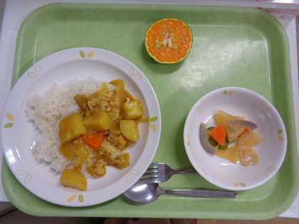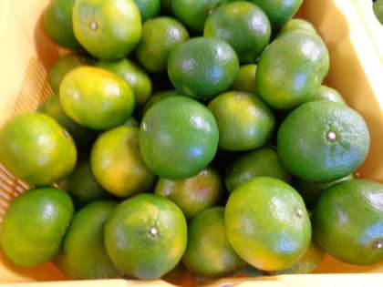 これから柑橘類も旬に入り、みかん・夢オレンジなどがたくさん出ます。今日は早香、温州みかんとポンカンを交配してできました。皮はまだ青いのですが、甘くて食べやすい果物です。