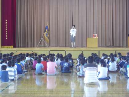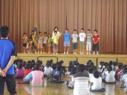先週、6年生と5年生が水泳記録会で、自分の記録に挑戦し、最後まで粘り強く泳ぎ切りました。他の人が泳いでいる時も「頑張れ」と応援している声が響き、とてもすばらしい記録会でした。