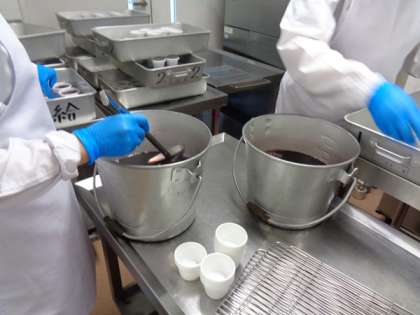 大きな釜でつくったゼリー液を、1個ずつ丁ねいにカップへ入れています。この後冷蔵庫に入れてしっかりとゼリーを冷やします。。