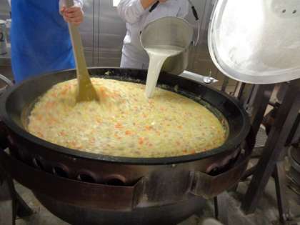 粒状とクリーム状のコーンをたっぷりと加えたコーンスープをつくっています。牛乳と米粉を混ぜて加え、とろみをつけていきます。