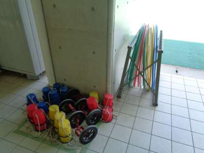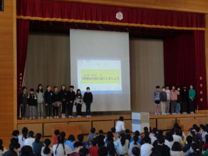 保健委員会集会では、手洗いや換気、けがをしたときの行動についてクイズにして発表しました。下の2枚の写真は、休み時間終了時の遊び道具の様子です。運動委員会や高学年の子どもたちがすすんで片付けをしています。