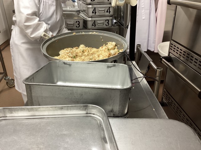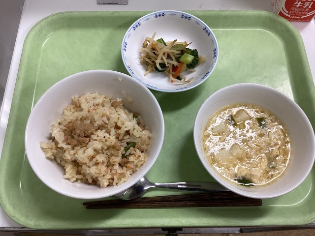 そぼろごはんのそぼろには、人参や椎茸などのみじん切りも一緒に炒めて加えています。しっかりと均等に味がなじむように混ぜています。