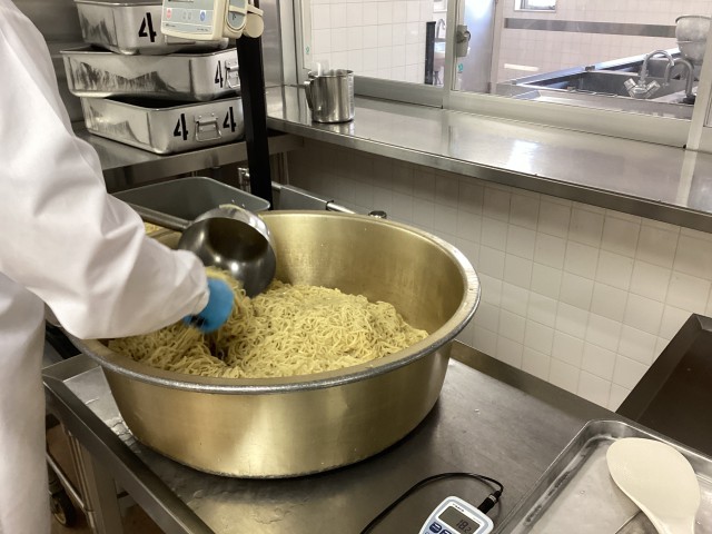 今日は人気があるしょうゆラーメンです。麺屋さんで注文をした中華麺をゆでて、各学級に測りながら分けています。