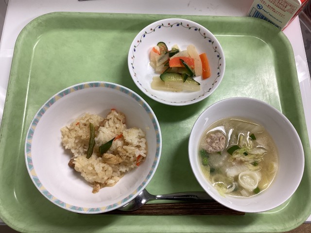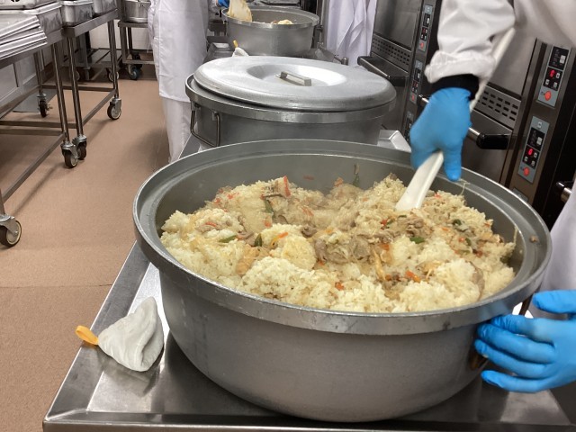 もち米とうるち米をしょうゆ味で炊き、具をしっかりと混ぜています。野菜・豚肉・油揚げなど具だくさんなおこわを、子どもたちはしっかりと食べていました。
