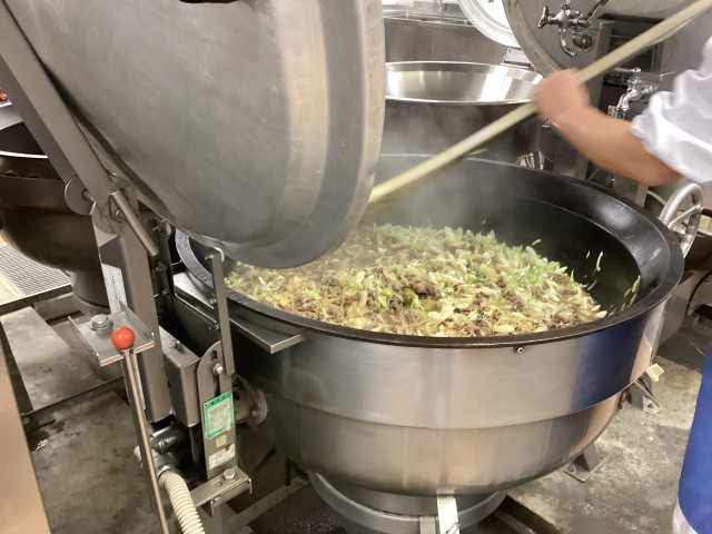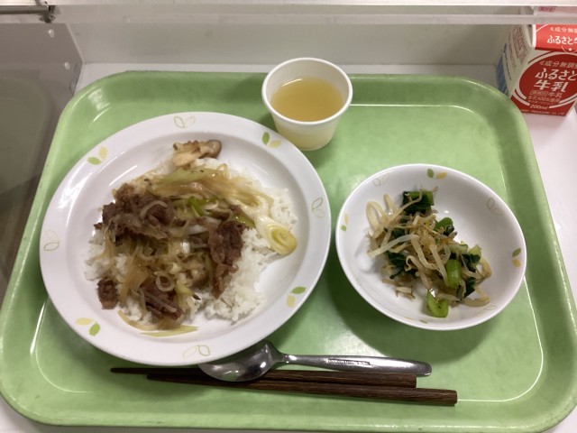 今日の牛丼には、肉の旨みがおいしいもも肉、脂の部分がおいしい肩肉の両方を加えて煮込みました。国産の牛肉をたっぷりと使用した牛丼を、子どもたちはしっかりと食べていました。
