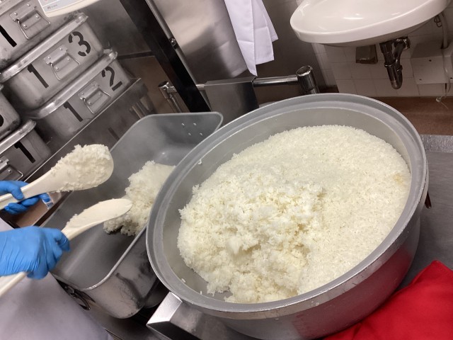 ごはんは大きな炊飯器で炊き、各クラスの食缶に入れています。今日の米は有機米、有機栽培の大切さについて、もぐもぐニュースの中で伝えました。