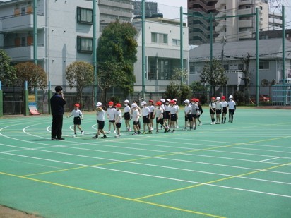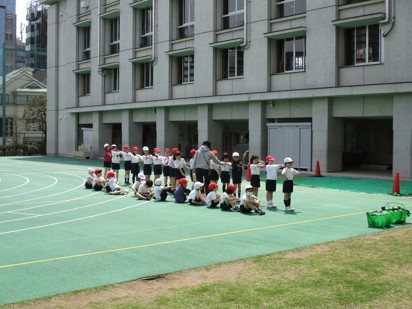 2年生の体育の様子です。安全に学校生活を送るために必要な集団行動を学んでいます。「前へならえ」「回れ右」を練習しました。