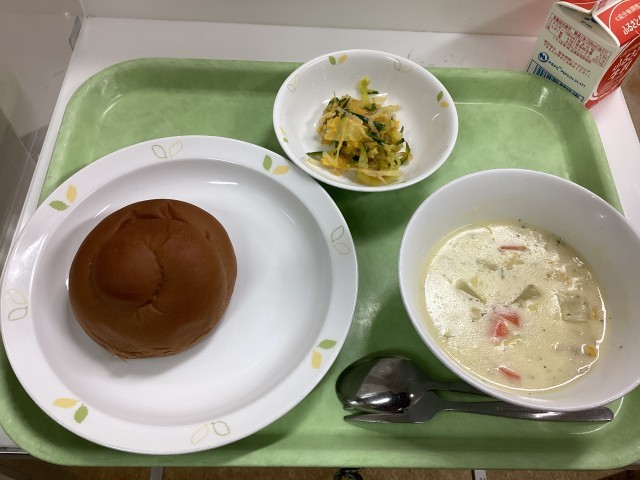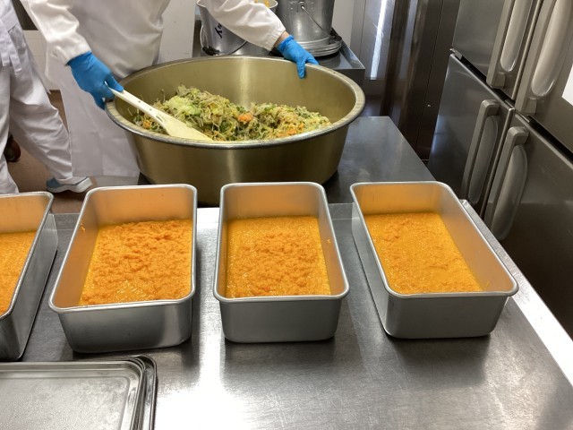 駒沢小学校の給食室には真空冷却機があるので、ゆで野菜は流水で冷やさず冷却機を使用し冷やします。ドレッシングはにんじん入りのドレッシングをつくり冷やした野菜と混ぜています。