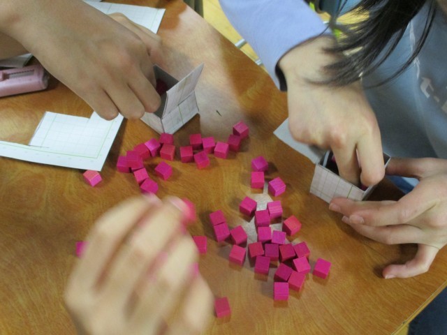 上・中:5年生が立体について学んでいます。シミュレーション教材や実物を用いるなど、体験を通して理解を深めています。