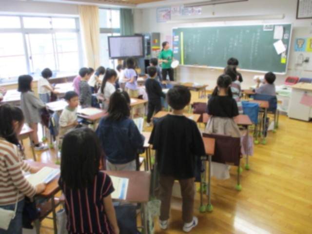 下:2年生の日本語の学習です。リズム太鼓に合わせて、日本語の響きやリズムを楽しみながら音読しています。