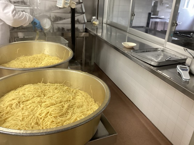 スパゲッティを大きな釜でゆでて、麺がつかないように油と混ぜて各学級に分けています。しっかりと計量しながら作業しています。