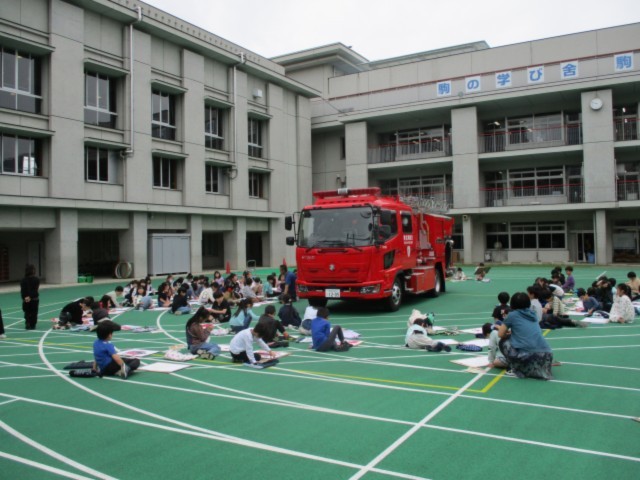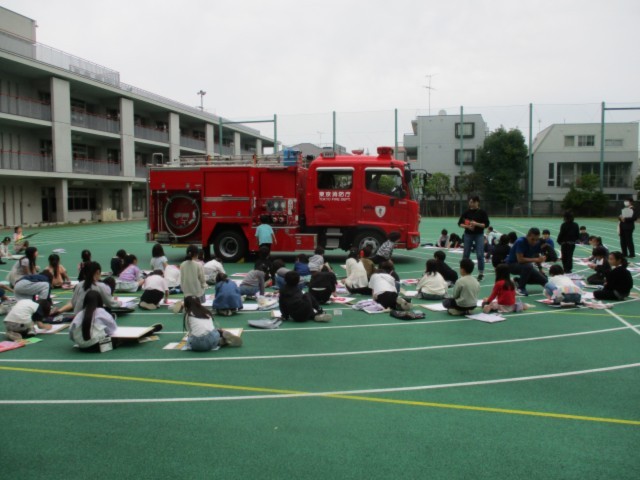 世田谷消防署からポンプ車が来ました。生で見る迫力に子どもたちは大喜びでした。75年間も続いている取組ですので、保護者の皆様の中にも体験された方がいらっしゃるのではないでしょうか。ぜひ子どもたちに感想を聞いてみてください。